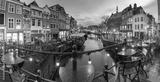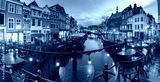 Beautiful old houses and illumination on the Leiden city embankment at sunset.