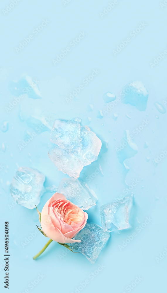 Pink rose flower and melting ice cubes with water drops on blue background. abstract texture. template for design. copy space