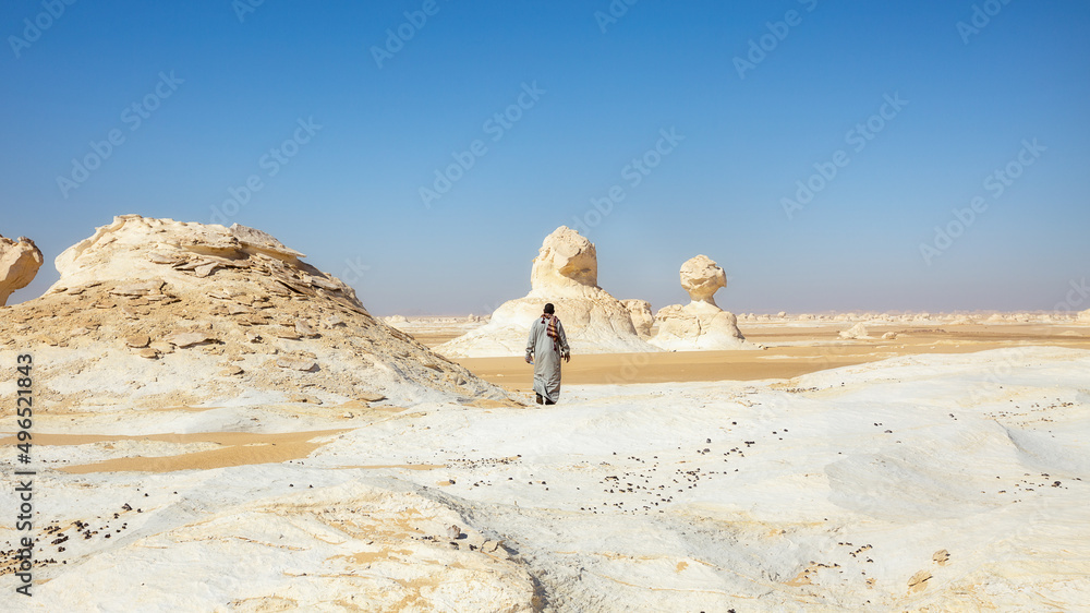 A man walks through the Black and White Desert. Egypt. Bakharia