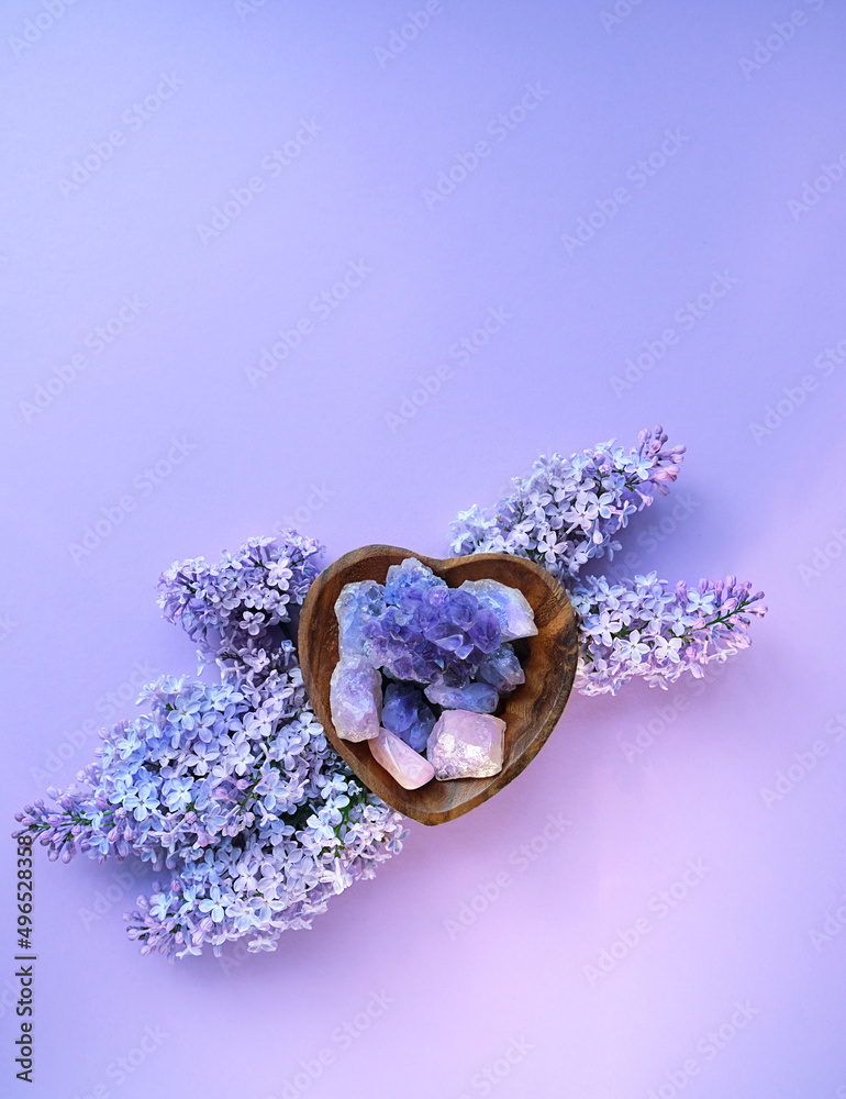 minerals set on plate and lilac flowers on purple background. Magic gemstones for esoteric spiritual practice, Healing Crystal Ritual, Witchcraft, Relaxation. Feng Shui, Good energy, reiki therapy