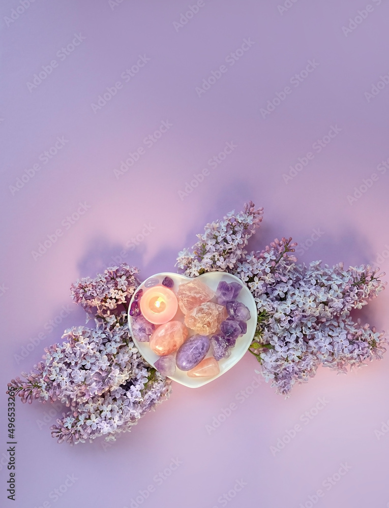 minerals, candle and lilac flowers on violet background. gemstones for healing Crystal ritual, spiritual esoteric practice, relaxation and meditation. top view
