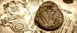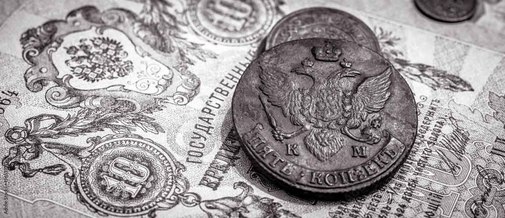Money of Russian Empire, old rare coins and banknote, vintage coat of arms, black and white photo. Texture and background theme.