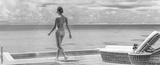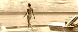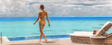 Luxury resort hotel woman walking on her private terrace deck of overwater bungalow villa with infinity pool view on turquoise ocean - honeymoon suite