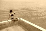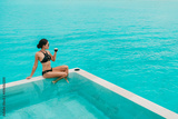 Woman drinking coffee at luxury hotel pool with view of turquoise ocean and overwater infinity swimming pool. Paradise getaway. Fashion model in stylish luxury bikini.