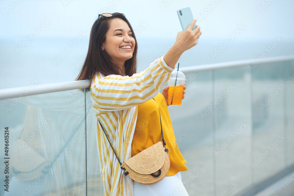 Cheerful and happy young overweight brunette woman 30-35 years old makes a selfie on a mobile phone. Fashionable plus size girl in casual clothes takes pictures of herself on a smartphone on vacation