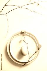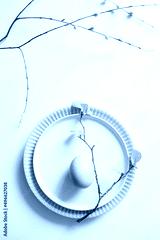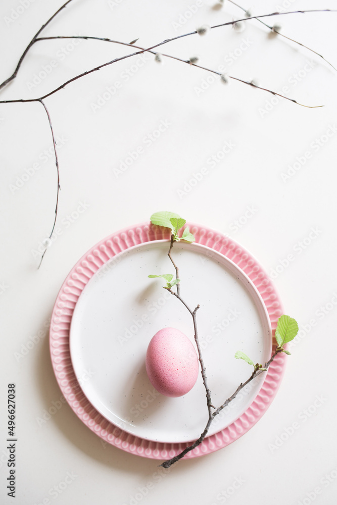 minimal table setting for Easter. pastel dusty pink egg on plate decorated with live blossoming branch