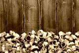 Wood shavings at table background. Wooden shaving on old plank board texture