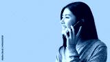 Happy Asian young woman talking on phone with smile Beautiful girl looking to copy space during talking on mobile phone with gray background Use for advertisement