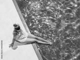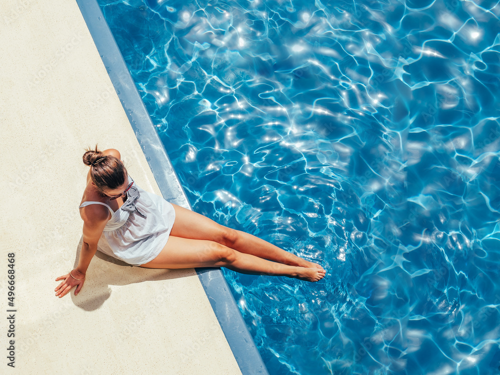 Fashionable woman sitting by the pool on the empty deck of a cruise liner. Closeup, outdoor. Vacation and travel concept