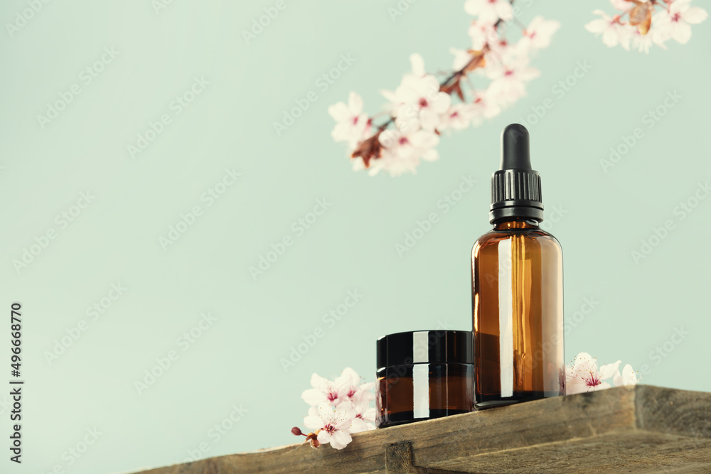 Amber glass dropper bottle with black lid, cream jar and spring flowers on glass shelf, green background. Skincare products , natural cosmetic. Beauty concept for face and body care, low angle view