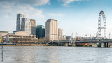 The South Bank, London. A view south over the River Thames towards Hungerford Bridge and the Royal Festival Hall arts venue and London Eye landmarks.