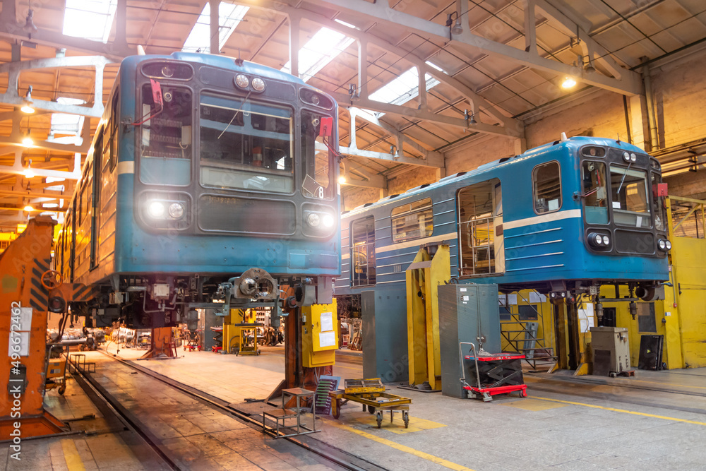 Passenger locomotives of the underground metro raised on jacks with headlights on in the depot, maintenance and replacement of engines and wheelsets, bogies.