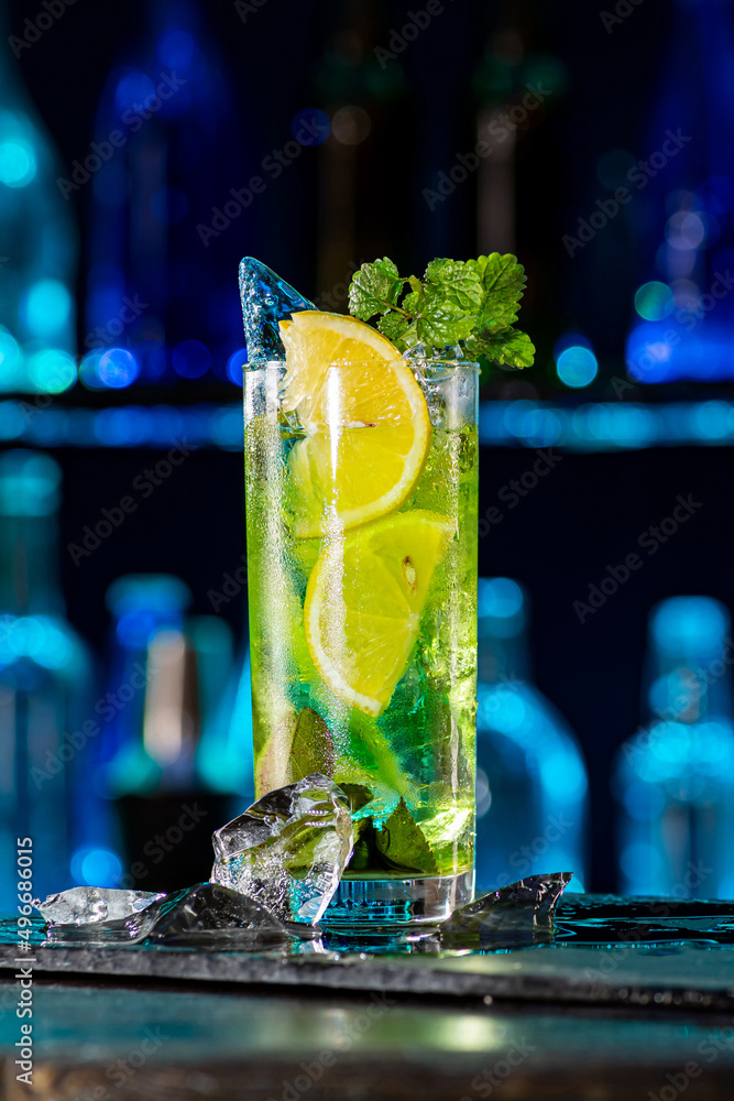 Cocktail with ice on bar counter in a restaurant, pub. Orange drink with juice. Fresh prepared alcoholic cooler beverage at nightclub. Showcases with bottles on dark background