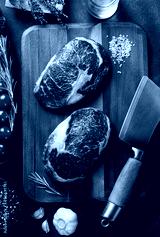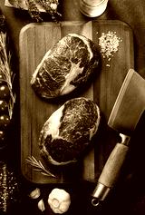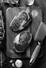 Fresh raw beef steak on cutting board. Stone background with ingredients for cooking. Ribeye top view