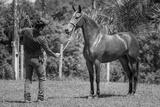 Wonderful bay mare of the Mangalarga Marchador breed with her trainer. Animal training and taming concept.