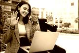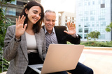 Young woman and caucasian man wave hello on business video call sitting on a bench outside office buildings. Copy space.