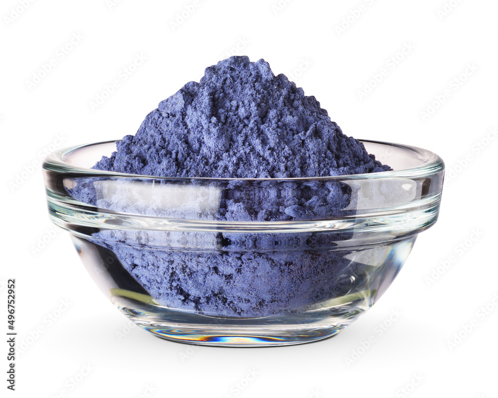 Butterfly pea flower powder or blue matcha in bowl isolated.