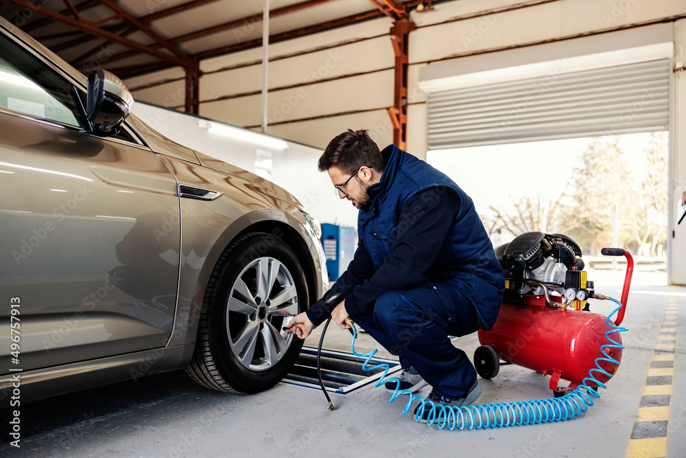 An auto mechanic crouching and preparing to inflate the car tire at garage.
