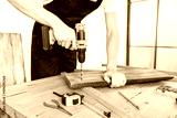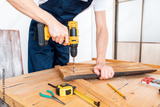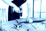 Handyman in blue uniform works with electricity automatic screwdriver.
