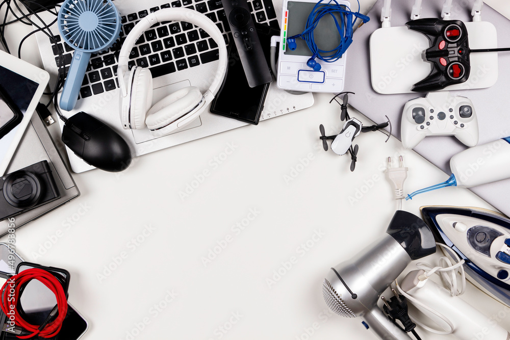 Old computers, digital tablets, mobile phones, many used electronic gadgets devices, broken household and appliances. Top view. Planned obsolescence, electronic waste for recycling concept