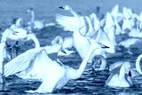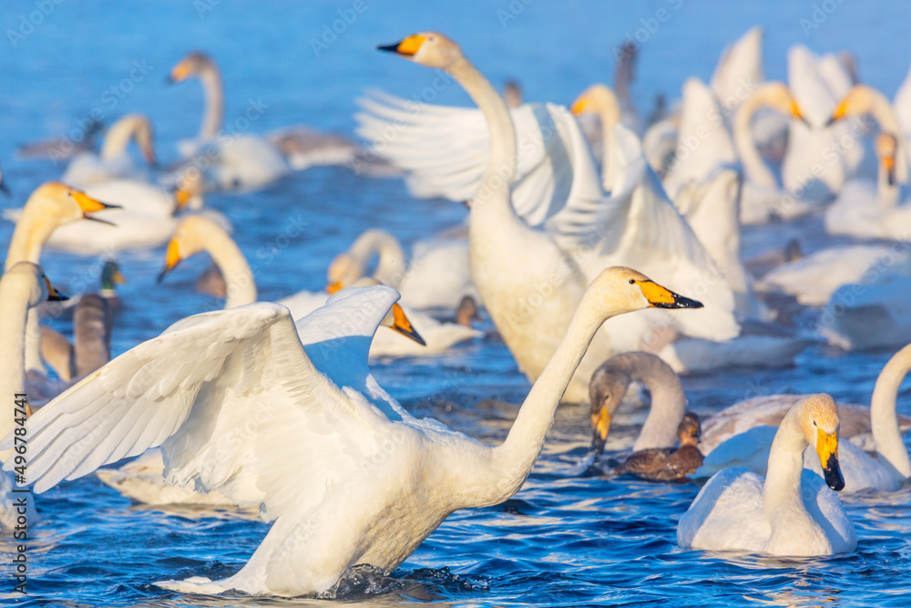 White whooper swans swimming in the nonfreezing winter lake. Altai, Russia