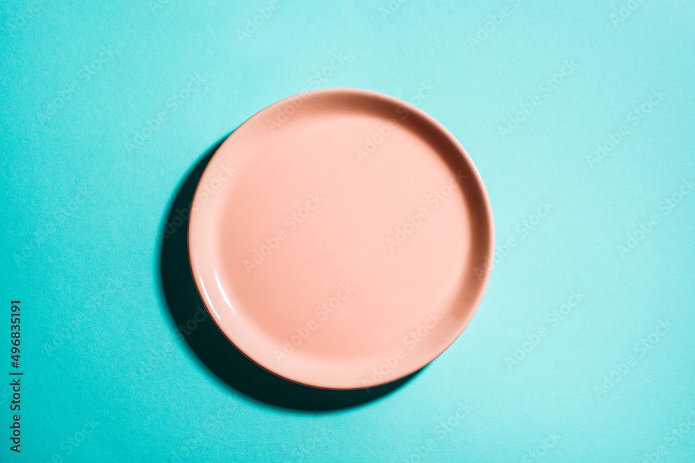 Pink empty plate on blue background