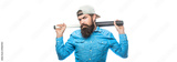 Violence and aggression concept, man hand holding baseball sport bat. Beardman holding a baseball bat. Isolated white background. Man swung the bat. Hooligan with baseball bat ready for fight