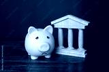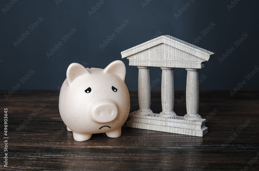 Sad piggy bank and state building. crisis, depletion of savings and bankruptcy. Financial default. Devaluation, inflation. Impoverishment. Refinancing and restructuring of debts. Insolvency