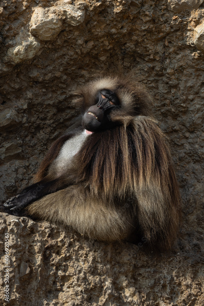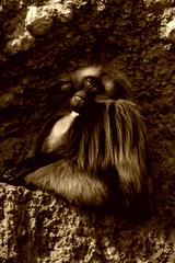 A group of monkeys looking at each other and stealing each other. They play together and feed each other like a big family. They are Geladas, Theropithecus gelada to be precise.