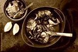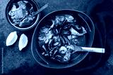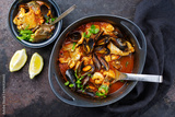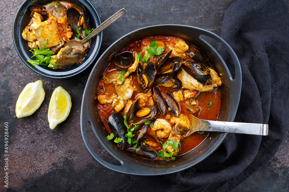Modern style traditional Spanish seafood zarzuela de pescado with fish, king prawns and blue mussels served in red sauce as top view in design pot