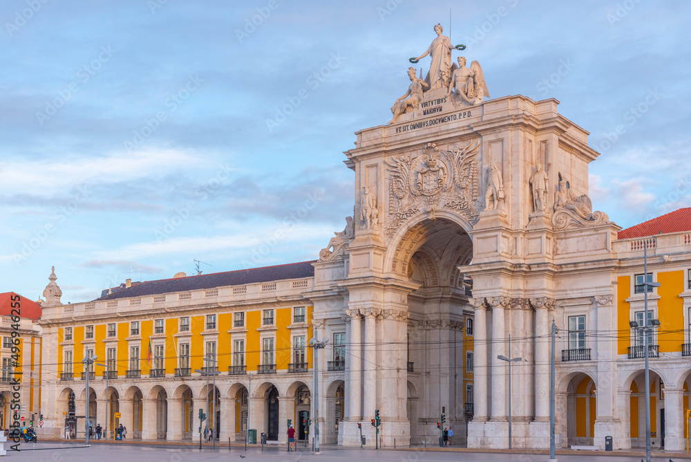 Sunrise view of Praca do comercio square in Lisbon, Portugal.