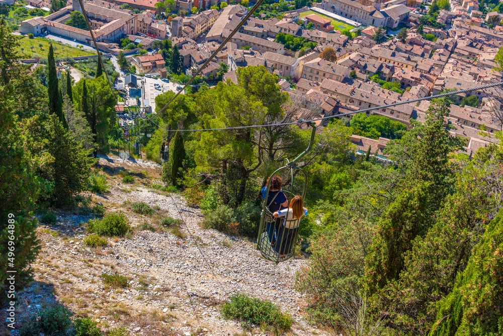 People are enjoying ride at Funivia Colle Eletto in Gubbio, Italy
