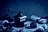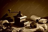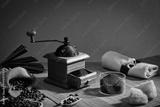 Close view of coffee grinder decorated with coffee pack and towel in wooden background for advertising