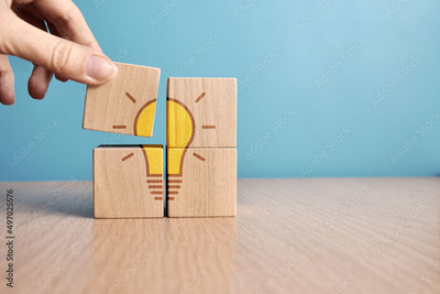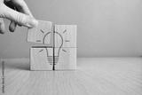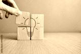 Drawing of a light bulb on wooden blocks. A person's hand collects a drawing of a light bulb as a symbol of the idea's origin