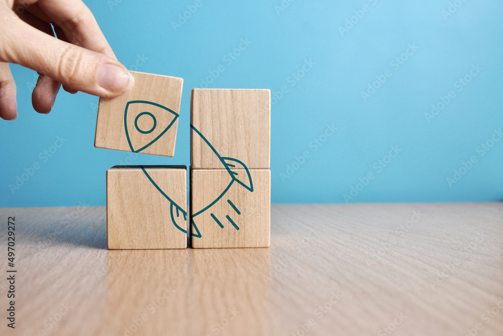Drawing of a rocket on a blue background. A symbol of a quick start of a new project in business