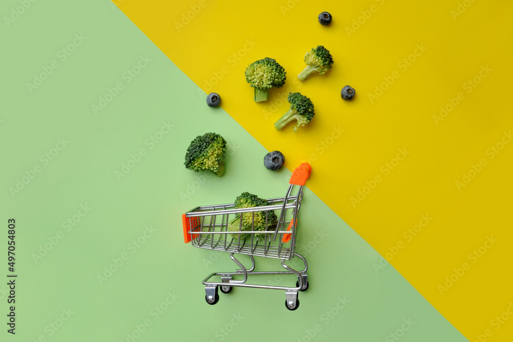 Green broccoli and blueberries in the shopping basket. Buy healthy food