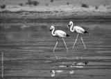 Two flamingos are walking on the water of the lagoon. Bolivia