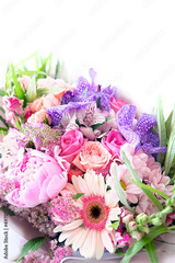 gentle beautiful bouquet with gerbera, peony, roses flowers close up on white abstract background. romantic floral festive image.