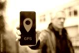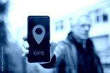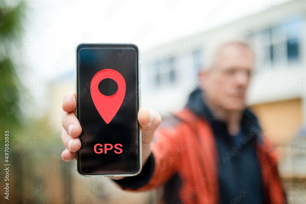 A man's hand showing a smartphone screen with a geolocation sign and the inscription GPS. The concept of using mobile devices for orientation in the city, taxi applications, geocaching