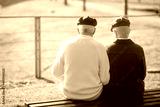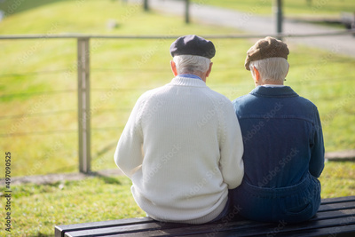 Back view of aged couple talking on bench. Relaxed Caucasian man and woman calmly sitting on bench and breathing fresh spring air, thinking of life. Active rest, relations of aged people concept