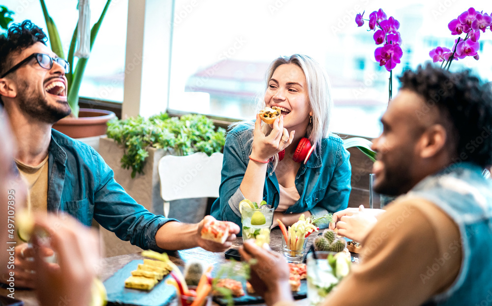 Multicultural friends eating together at luxury pub restaurant - Life style concept with trendy multiracial people having fun on happy hour at bar eatery - Vivid filter with focus on central woman