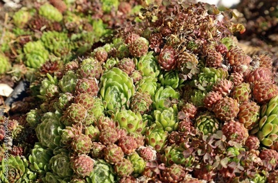 Colorful Sempervivum succulent plants at the beginning of sprngtime. They are commonly known as houseleeks.