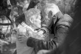 Side view of aged couple under trees in park. Happy grey-haired woman and man standing head to head with closed eyes, enjoying life getting positive emotions. Love and relations of aged people concept