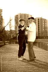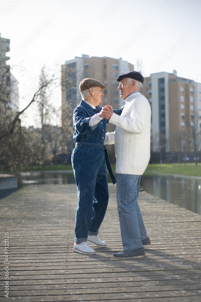 Side view of happy aged couple dancing in park. Smiling man and woman in modern clothes and caps holding hands dancing, having fun together. Relations, love and active rest of aged people concept
