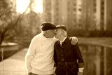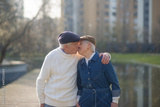 Portrait of happy elderly couple kissing in park. Grey-haired man and woman in casual clothes resting together outdoors hugging and kissing. Relationships, love and active rest for aged people concept