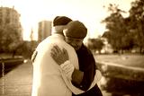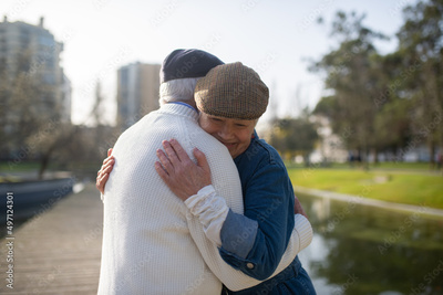 Portrait of senior couple during romantic date. Caucasian man and woman standing near pond in city park gently hugging each other and feeling happy. Relations, leisure activity of aged people concept