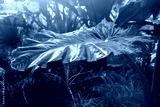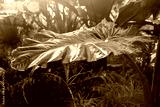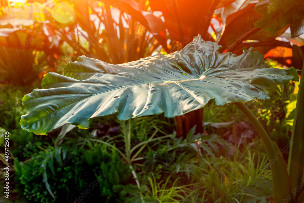 Leaves of a tropical plant Alocasia macrorrhiza in the rays at sunset.