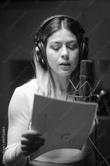 Portrait of young singer holding text and singing in studio. Caucasian woman in headphones recording song in sound recording studio. Creating music concept
