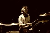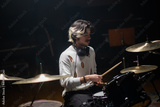 Concentrated young man training on drum set in studio. Musician with headphones rehearsing or recording drums. Drummer training concept