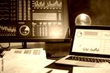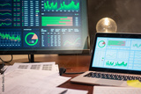 Laptop, papers and computer on table. Gadgets and other late night work stuff needed for late night work in office. Technology, job, office concept